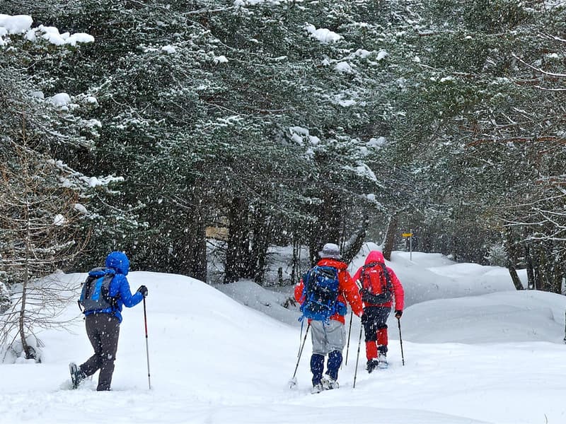 Ciaspole, bastoncini, scarponi e abbigliamento invernale da montagna, guanti, cappellino, per chi le ha anche le ghette.