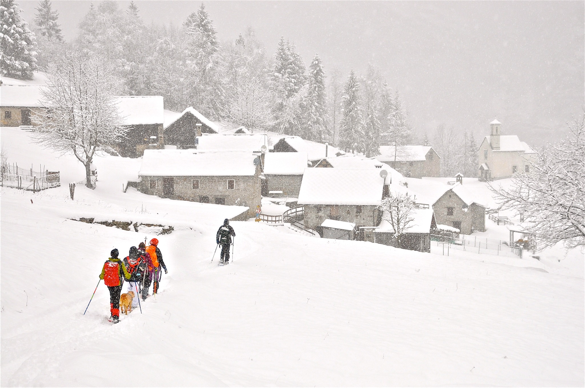 Dalle previsioni meteo dovrebbe nevicare con poca intensità. Cosa chiedere di piu? Fosse così, ciaspoleremo in un paesaggio da cartolina come nella foto di presentazione della scheda tra alberi e case ammantate dal candore della neve in un’atmosfera davvero unica.