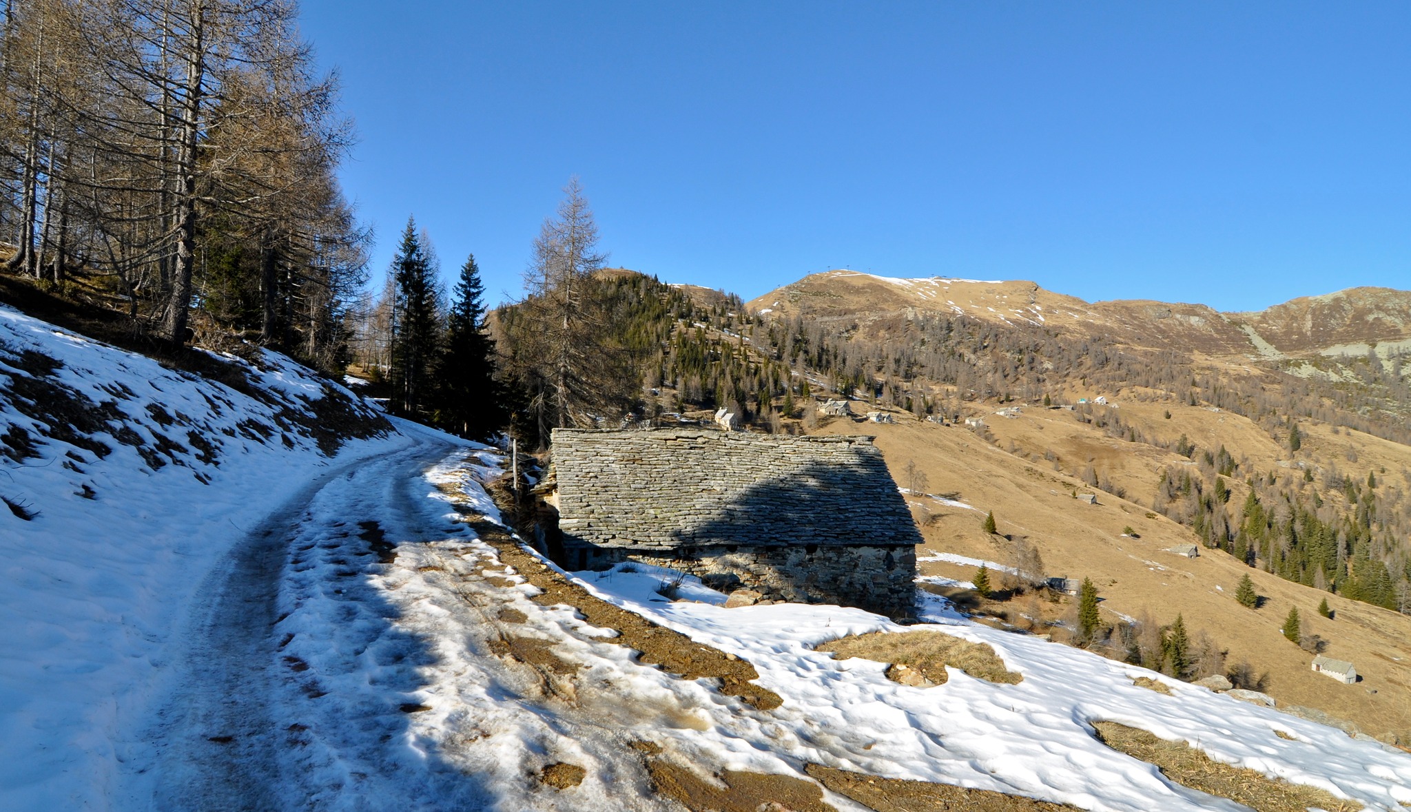 la stradina consortile, saliremo all’interno del bosco dove incontreremo gli antichi “curt” degli alpeggi ora trasformati in belle casette di montagna.